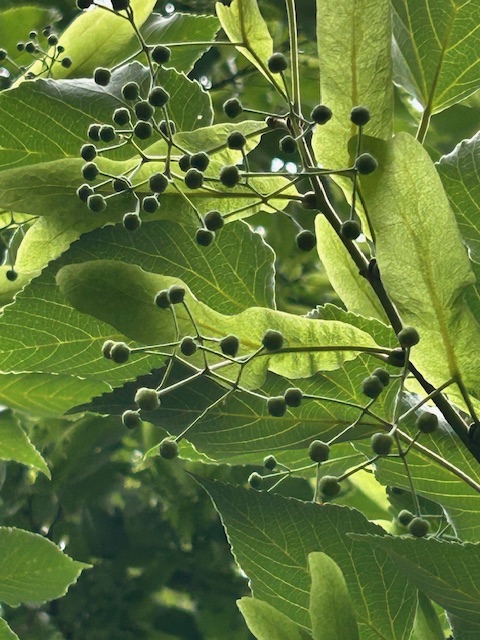 「菩提樹(ぼだいじゅ)」はシナノキ科の落葉高木。寺院に多く栽培されている。6月頃淡黄色の花を咲かせた後、秋に直径7~8ミリの球状の実をつける。乾燥させた実は数珠玉などに利用される。「菩提の実」などともいう。釈迦がその下で悟りを開いたと伝えられるのはインド菩提樹(クワ科の常緑高木)で、これとは全く別種の樹木。