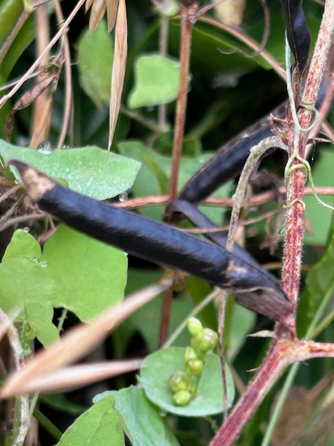 烏野豌豆(からすのえんどう)はソラマメ属の蔓性の一年草又は越年草。標準和名は「矢筈豌豆(やはずえんどう)」。本州以南の全国の平地や山沿いの野原、道端、土手などに自生する。春から初夏に蝶形で紅紫色の花を咲かせた後、サヤエンドウを小さくしたような平たい莢(さや)がつく。熟すると黒くなり、晴天の日に裂けて種子を飛ばす。なお、歳時記には掲載されていない。