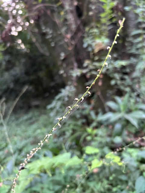 「水引」は山野の林縁などに多いタデ科の多年草で、8~10月、細長い花軸を伸ばし、通常赤い小花をつける。その白花種が「銀水引」。山野に自生するほか、園芸品種もある。「水引の花」(秋季)の傍題。