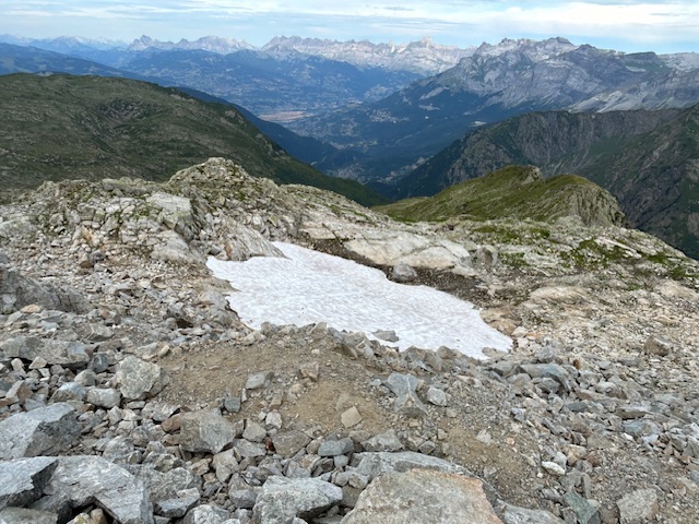 ブレヴァンからプランプラまでのトレッキングコースは、ところどころに雪渓が融け残っているがれ場だが、要所要所に標識もあり、危なげなく辿ることができた。