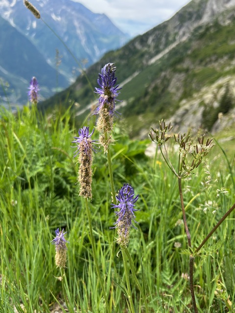 下の写真はタマシャジン。ヨーロッパアルプスの高山植物の一つ。ブレヴァンからプランプラまで500メートルほどの標高差だったが、がれ場を下るにつれて、足元に咲いている花が、アルペンローゼ、岩桔梗、タマシャジンなどからコウリンタンポポ、ブロードリーフタイム、白玉草などへと変わっていった。高山植物一つ一つに、生存にもっとも適した標高があるのだろう。