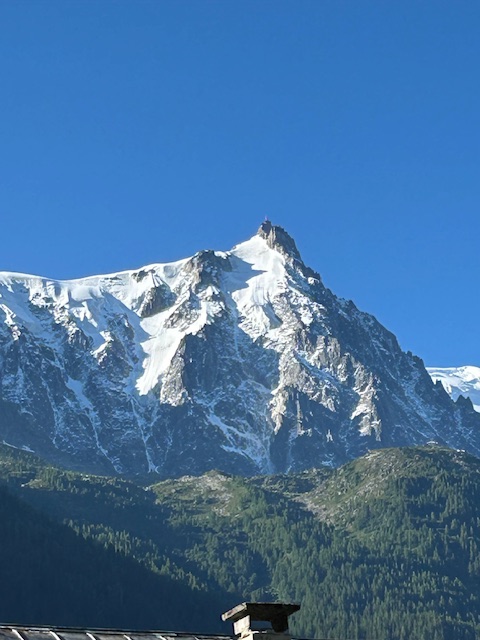 下の写真はフレジェール(標高1877メートル)から撮ったエギーユ・デュ・ミディ。モンブラン山系の主峰の一つで、山の名には「正午の時計の針」という意味合いがある。シャモニーから見ると、正午に太陽がこの山の頂上に座ったように見えるところが山の名の由来という。