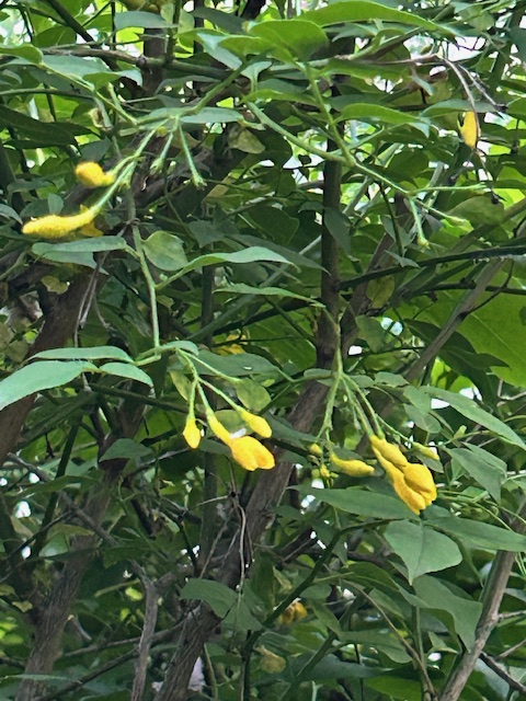 ヒマラヤ原産のモクセイ科ソケイ属の常緑低木。日本へは明治時代に渡来した。初夏に、ジャスミン(ソケイ)に似た形の黄色い花を咲かせることからこの名がある。庭木として栽培されるほか、生け花の花材としても利用される。花の香りはそれ程強くはない。なお、「ジャスミン」はモクセイ科ソケイ属の植物全体の総称で、「素馨(そけい)」「黄素馨」「茉莉花(まつりか)」はいずれもジャスミンの一種。手元の歳時記には「素馨」「ジャスミン」は「茉莉花」の傍題になっている。