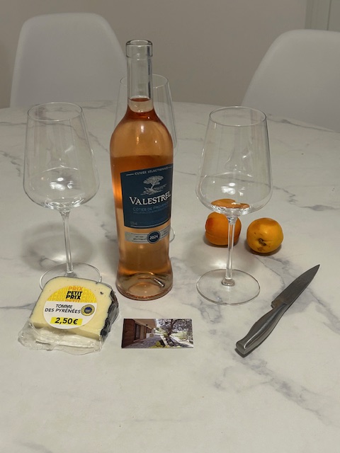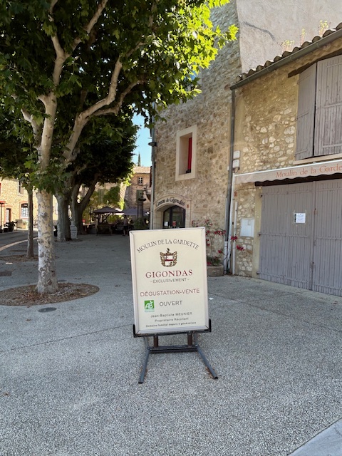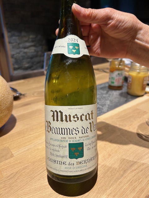 プロヴァンスのホテルに滞在中の一日、私たちはワイナリー巡りをした。やや内陸部に位置し、ニースより暑さが厳しかったから、日の出の頃から車を走らせた。早朝だったため、ワイナリーの多くは門を閉ざしていたが、私たちはジゴンダス(Gigondas)村の店で赤ワインを買い、ボーム・ド・ヴニーズ村でマスカットワイン(白ワイン)を買うことができた。どちらの店でも、カウンターのところで地元のワインを試飲させてくれた。下の写真はその時買ったマスカットワイン(甘口)。ボトルのラベルに、ドメーヌ・デ・ベルナルダンとの生産者名が見える。ローカルな生産者の顔が見えるところが、地産地消のフランスらしいところ。