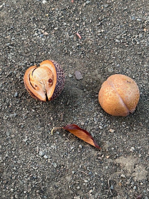 トチノキの実。トチノキは、全国の低山渓流沿いに自生する落葉樹。「橡(とち)」は「栃」とも表記する。「橡」はブナ科コナラ属の落葉樹であるクヌギを指す古名でもあるが、トチノキを指す漢字としても使われる。一方、「栃」は主にトチノキを指すために日本で作られた国字。果実の丸く厚い殻の中には栗に似た種がある。縄文時代から食用にされ、今もトチモチなどにして食す。近縁種のセイヨウトチノキは果実の表面に刺がある。