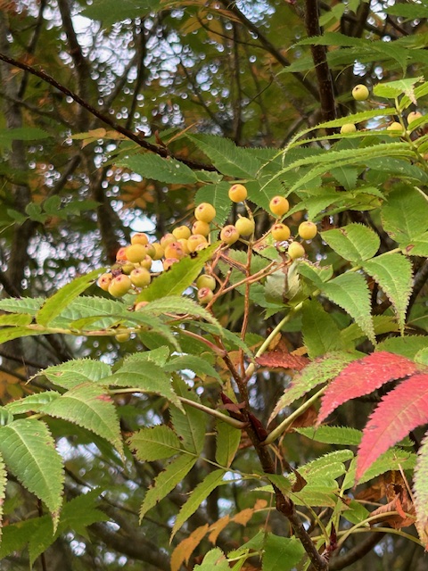 櫨(はぜ)の木はウルシ科の落葉高木。秋の紅葉が美しく庭木として植えられるほか、果皮から蝋をとるためにも栽培される。秋に大豆ほどの卵形の実が生り、熟れると緑色から濁ったような黄色に変色する。なお、「櫨ちぎり」(秋季)は櫨の実から蝋をつくるため、熟れた櫨の実を収穫すること。