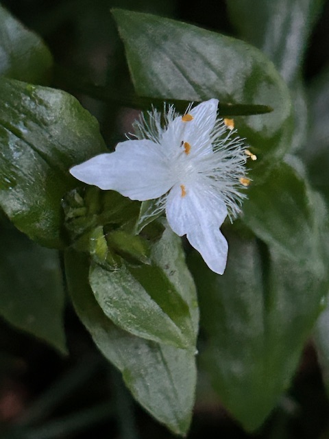 南アメリカ原産のツユクサ科の一年草。昭和初期に観賞用として日本に渡来し、その後野生化している。やや湿っている日陰や水辺に群がり生える。初夏から夏にかけて白い花弁の三角形の花を咲かせる。なお、歳時記には掲載されていない。