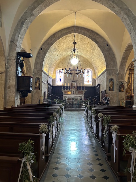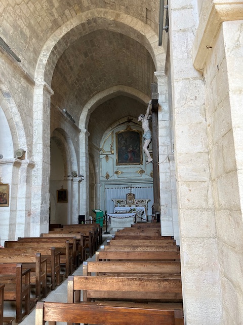 下の写真は、プロヴァンスのリュベロン地方にある鷹の巣村ルシヨンのサン・ミシェル教会。12世紀に建てられ、その後何度も修復された。教会は村の高台に位置し、村の象徴的な建物の一つ。かつては外敵からの防御機能も果たしていたという。炎天を歩き回った私たちは、ここでは石の冷たさと静けさに包まれてひと時を過ごした。