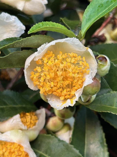 雨雲が南に去った朝、久し振りの朝日が茶の花の蘂を金色に染めた。白い花びらに包まれた黄色い蘂が仄かに覗く咲き始めの頃がいい。また、山茶花に似たその清潔な香りもいい。