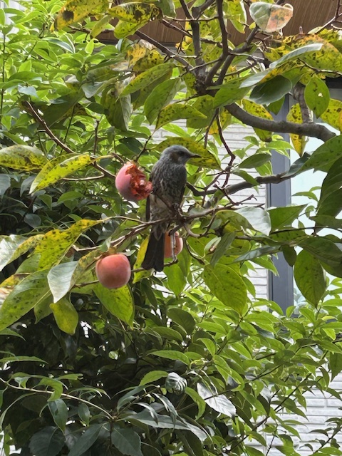 朝、庭先に柿を食べに来ていた鵯(ひよどり)。鵯はヒヨドリ科の野鳥で、全国に留鳥として生息しているお馴染みの鳥。関東近辺では四季を通して見られる。渋が抜けて柿が甘くなったのか、ここ数日は鵯や目白が頻りに食べにくる。大柄な鵯が来ると、目白は姿を消してしまう。無遠慮で図々しいところもあるが、憎めない剽軽者である。