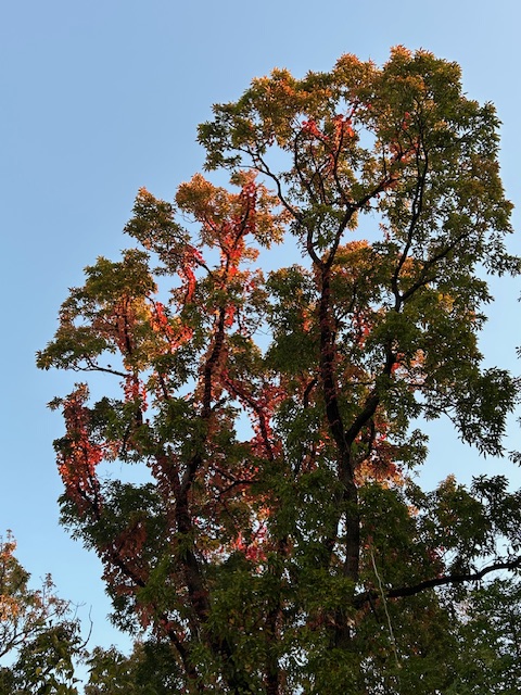 雑木林の櫟(くにぎ)に蔦(つた)が絡まっていた。鮮やかに紅葉しているのが蔦で、櫟の紅葉はくすんだ茶色をしている。蔦はブドウ科ツタ属の蔓性木本植物で、晩秋には鮮やかに紅葉する。俳句では、単に蔦と言うだけで、紅葉した蔦を指す。