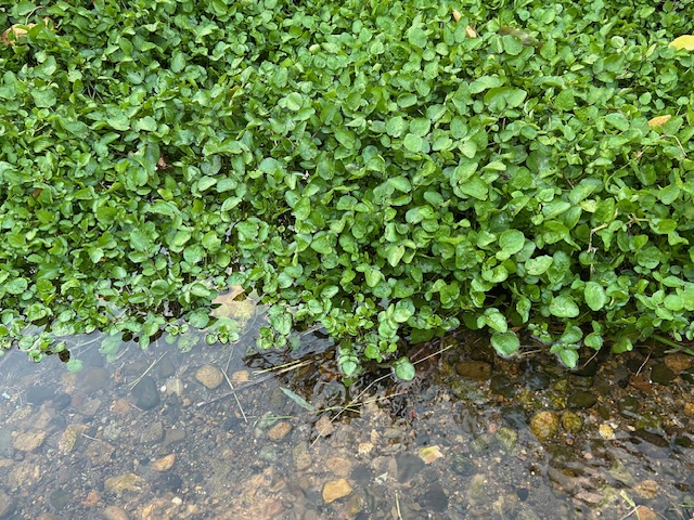 11月中旬の小川の縁に生えていたクレソン。クレソンはヨーロッパ等原産のアブラナ科の多年草。食用・栽培目的で明治以降に日本へ持ち込まれたが、その後逸出して、水辺付近の湿地で野生化している。寒さに強く、冬も鮮やかな緑色。収穫期が春なので、春の季語になっているが、近年では年間を通して店頭に並ぶ。肉料理の付け合わせやサラダなどになる。