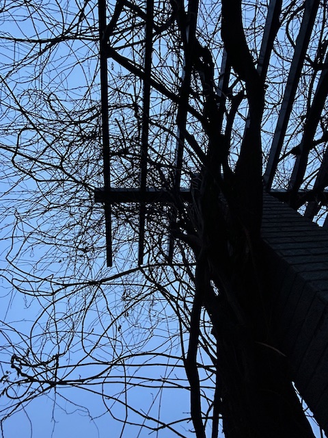 冬、葉が落ちて枯れた藤の木。夏に生い茂っていた葉が全て落ち、棚や樹木に絡みついたまま枯れている姿は、蕭条とした物悲しさを感じさせつつも、来たる春への生命力を秘めた姿である。