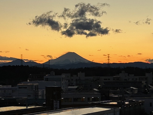12月下旬のとある日の暮れぎわの富士山。関東地方の私の住まいから南西に位置し、夕暮はいわゆる影富士になる。時によって驚くほど大きく見えたり、小さく見えたりするのは、目の錯覚によるものだろうか。眼下には、灯ともし頃のわが町が広がる。