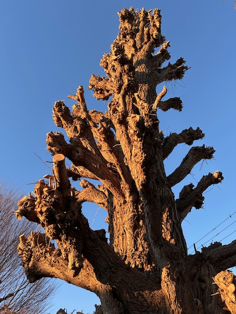 1月6日の朝、日の出を浴びている医療センター前庭の枯銀杏。「朴直」という言葉が思い浮かぶようなその姿をしばらく眺めた。樹齢は不明だが、それなりの年数を経た古木。
