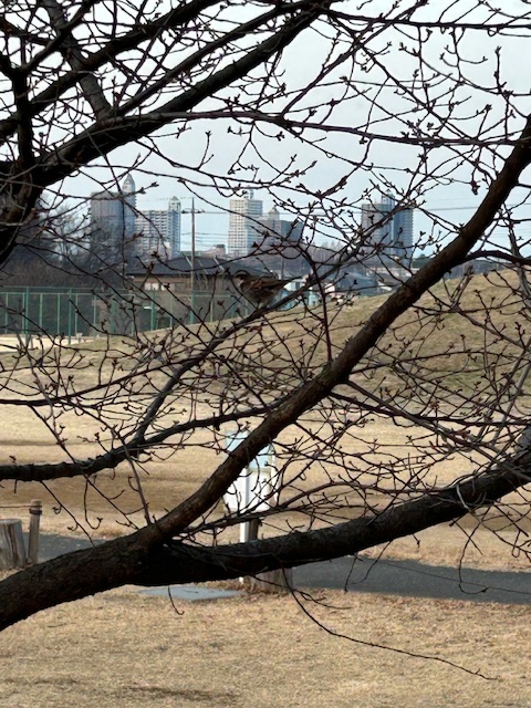 朝、桜の枯枝に止まっていた鶫(つぐみ)。鶫はシベリアなどで繁殖し、秋、餌を求めて日本に渡ってくる。冬の間は単独行動し、木の実のほか、土中のミミズや昆虫などを食べている。木の実などが大方食べ尽くされる大寒の頃は、地面に下りて土中のミミズなどを漁っていることが多い。