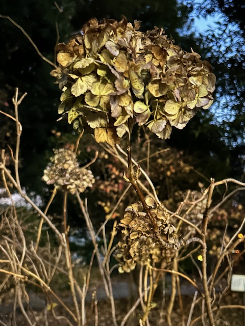 紫陽花(あじさい)は、ユキノシタ科アジサイ属の落葉低木の総称で、日本在来のガクアジサイやその改良品種、セイヨウアジサイなど多くの品種がある。梅雨時の花の盛りが過ぎると薄緑色に変色し、秋には赤みを帯びることもある。その後、冬になると枯れて薄茶色になり、いつまでも花の形をとどめている。「枯茨」「枯萩」「枯菊」などとは異なり、歳時記に掲載されていないが、「名の木枯る」の一情景として、「紫陽花枯る」「枯紫陽花」などと表現することはできるだろう。