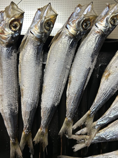 カタクチイワシなどの鰓(えら)に藁や竹串を通して干したもの。塩漬けしたイワシの鰓から口にかけて串などを通し、数匹を束ねて干す。目に通すのが「目刺」、鰓に通すのが「頬刺」。冬の乾燥した気候で作られ、春に食べ頃を迎える。昔からの庶民の味である。「目刺」の傍題。