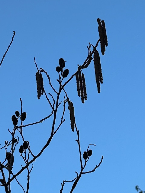 立春が近いある日の朝、公園の池の辺の榛(はん)の木が花穂を垂らしていた。榛の木はカバノキ科の落葉灌木で、雌雄異株。早春の頃、穂状の雄花が長く垂れ下がって咲くので「榛の花」は春の季語。近年は、梅と同様立春前から咲き始める。