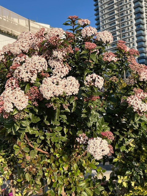 常盤莢蒾はヨーロッパ、北アフリカ原産のレンプクソウ科ガマズミ属の常緑低木。公園などに植えられる。3〜4月頃、白い小花を散房状に咲かせる。秋から冬にかけて実が黒く熟す。なお、日本に自生する一般的な莢蒾(がまずみ)は、 スイカズラ科の落葉低木で、初夏の頃に白い花を咲かせ、秋に実が赤く熟す。なお、常盤莢蒾は、花も実も歳時記に掲載されていない。