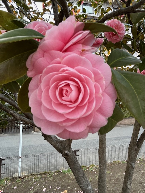 古くから親しまれてきたユキツバキ系の園芸品種。花びらが幾重にも規則正しく重なった千重(ちえ)咲きが特徴。公園や庭などに植えられる。花色は淡いピンク色。なお、椿はツバキ科ツバキ属の常緑高木。主に3〜4月頃にかけて咲き続ける。「椿」の傍題。