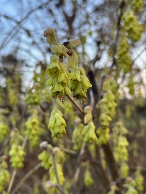 マンサク科の落葉低木。高知県の山地に自生していたことからこの名がある。葉が出る前に淡い黄色の小さな花を穂状に垂らす。本種の仲間には、他に、日向水木(ひゅうがみずき)、高野水木などがあるが、土佐水木は日向水木よりも一回り大きく、花序が長いのが特徴。庭園などに植えられる。