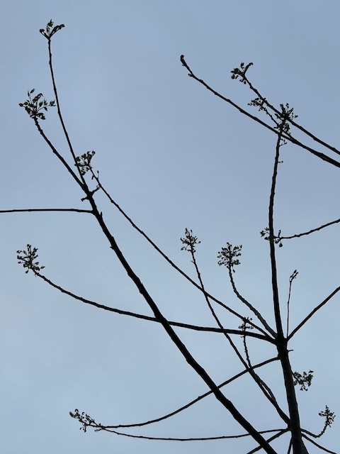 「庭漆(にわうるし)」は、中国原産のニガキ科の落葉高木。日本には明治時代に渡来し、街路樹などとして植えられたほか、道端や河川敷などで広く野生化している。別名「シンジュ(神樹)」。ウルシの名がついているが、ウルシ科のウルシとは全く別種の樹木。晩春の頃新芽を伸ばす。芽吹いてからの成長が非常に早い。歳時記には掲載されていないが、「木の芽」の傍題と考えていいだろう。