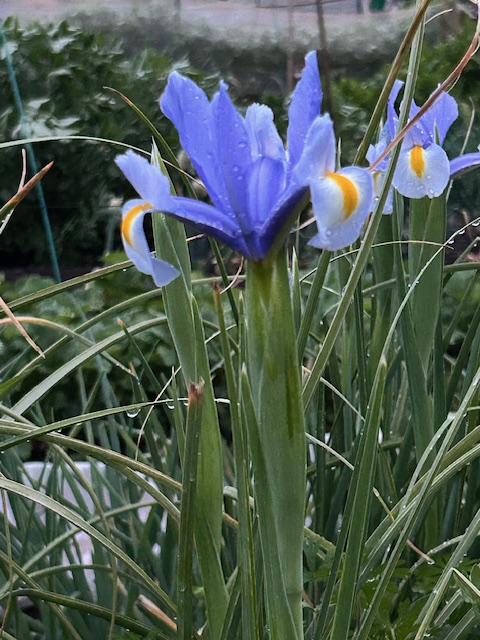 「アイリス」は、アヤメ科アヤメ属の多年草で西洋系アヤメの総称。その中で「ダッチ・アイリス」は、オランダで品種改良された球根アイリス。やや乾燥した場所を好む。4~5月に、アヤメに似た優雅な花を咲かせる。花弁の基部に網目模様がある。「ジャーマン・アイリス」よりすっきりした花姿が特徴。別名「オランダアヤメ」。