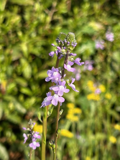 北アメリカ原産のオオバコ科の越年草。1940年代頃日本に定着・帰化したとされる。4月から6月にかけて道端や芝生に、薄紫の唇形の花を咲かせる。花の形が、砂浜などに自生する海蘭(うんらん)に似ていること、また、細い葉が松に似ていることからこの名がある。なお、歳時記には掲載されていない。