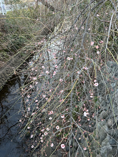 1月28日の朝に疎水べりで撮った枝垂梅。この梅もやはり立春前に咲き始めていた。枝が柳のように垂れ下がり、淡いピンクの花を咲かせる。この時期、疎水は朝方の放射冷却で結氷することが多い。