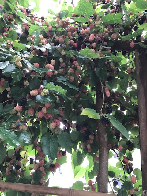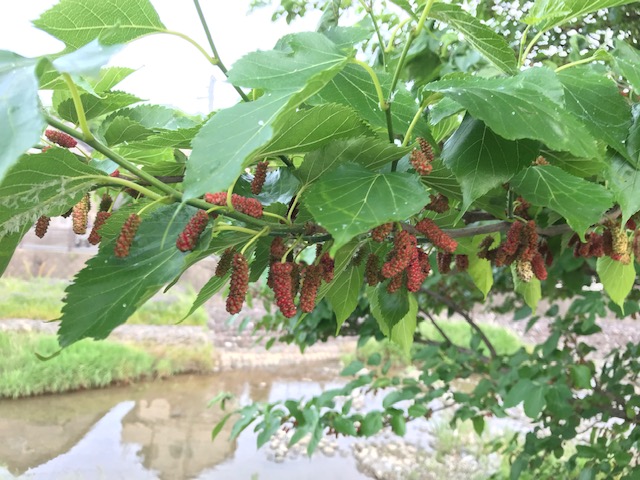 桑はクワ科クワ族の落葉高木。近年目にする桑畑はかつて行われていた養蚕の名残だが、自生の桑の木を山野や川べりなどで目にすることも多い。春に穂状の花をつけた後、5、6月頃実が赤から紫黒色に熟れて食べ頃になる。実は多くの花が集まった集合果で、「桑苺」とも呼ばれる。正岡子規が「桑の実の味はあまり世人に賞翫されぬのであるが、その旨さ加減は他に較べる者もないほどよい味である。」(くだもの)と記しているように、よく熟した桑の実を摘み取ってその場で食べる味わいは、苺に勝るとも劣らない。