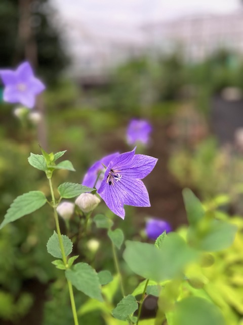 桔梗(ききょう)は、キキョウ科キキョウ属の多年草で、日本を含め東アジアに広く分布する。姿や色が涼やかなことから、観賞用に庭などに植えられることも多い。秋の七草の一つであり、単に「桔梗」といえば秋の季語だが、花期は7月から8月であり、盛夏の頃咲いているのを見かける。