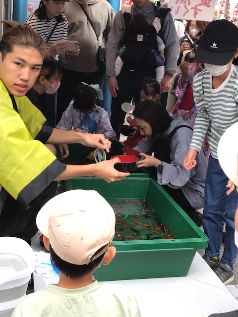 祭や縁日の露店で水槽に金魚などを泳がせ、紙の杓子ですくったり、餌なしの鉤で釣らせたりするもの。金魚すくい。子供に人気がある、夏に相応しい風物。