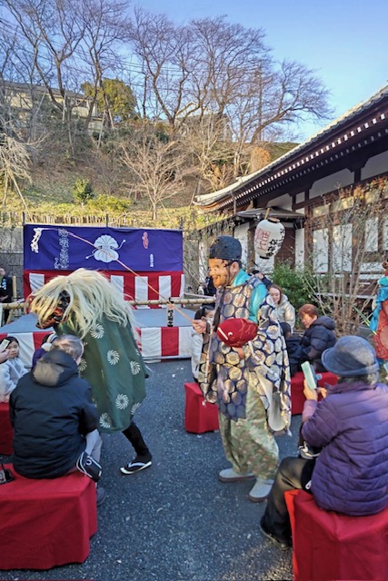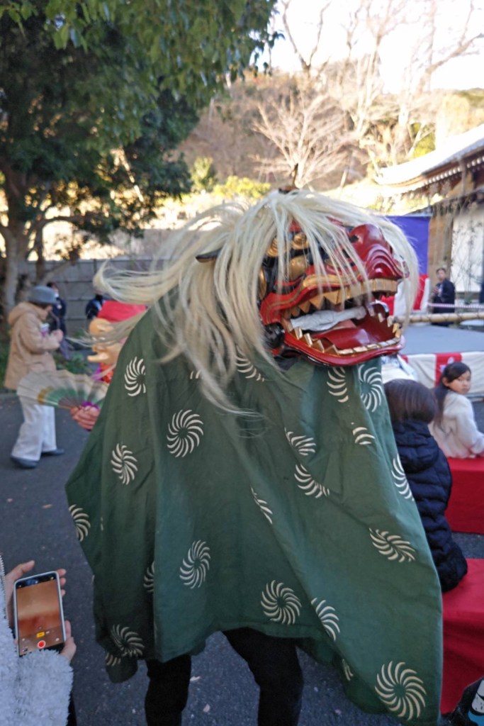 獅子のかぶりものをした神楽の一種で、正月の門付芸の一つ。笛や太鼓で囃しつつ家々を訪れてめでたい芸を披露し、新しい年の訪れを祝福する。1人で獅子頭をかぶって舞う一人立ち、胴体に2人が入る二人立ちなどがある。古く中国から伝来し、十六世紀に、伊勢神宮で疫病を祓う神楽として始まった。その後、伊勢神宮の御師と呼ばれる神官が、獅子頭を携えて各地を回ったのが現在の獅子舞の始とされる。獅子は古代中国で生まれた想像上の動物、悪霊を祓い幸福をもたらす霊獣。