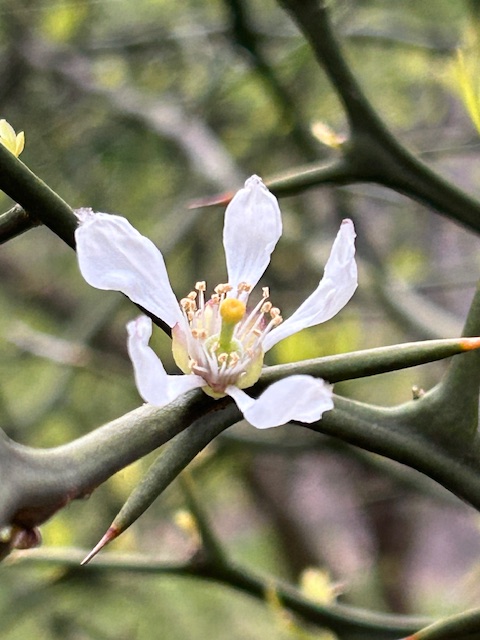 枳殻(からたち)は中国原産のミカン科の落葉低木で、唐橘(からたちばな)の略。古く日本に渡来し、当初は実を薬用とするために栽培されたが、後に野生化し、本州中部以南の暖地の山中に自生する。現在では庭木や生垣として植えられ、また、果樹園で柑橘類の台木として使われることもある。晩春の頃、若芽に先立って白色五弁の香りのよい花を咲かせる。秋には梅の実ぐらいの実がつき、黄熟する。