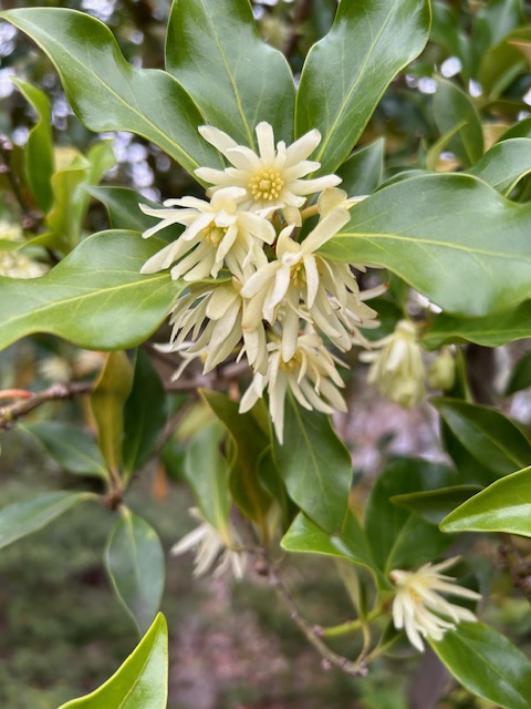 樒(しきみ)はシキミ科の常緑小高木。本州南部の山地に自生するほか、寺院や墓地にも植えられる。晩春の頃、葉腋に黄白色の花が群がるように咲く。仏や墓 に供えたり、抹香や数珠の材となるなど仏事と関係が深い。