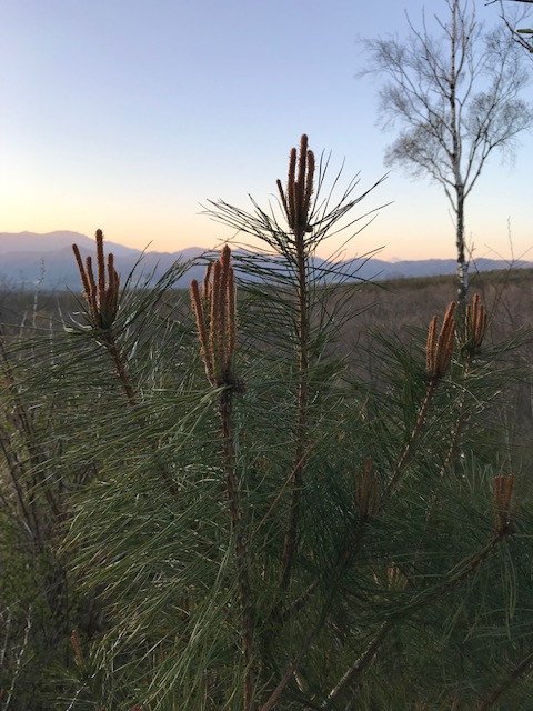松の新芽のこと。晩春の頃、松は、枝先に蠟燭のような新芽を幾本も直立させる。「若緑」「緑立つ」ともいう。若々しく、季節の勢いを感じさせる情景だが、庭園などでは、松を弱らせないために、庭師が新芽の伸び過ぎたのを適度に摘み取る。松の芯が伸びると、やがてそこに花をつける。