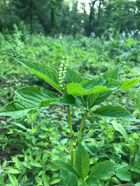 センリョウ科の多年草で、日本全国の低地や山林の日陰地に自生。晩春の頃、四、五枚の葉の中央から花穂を二、三本伸ばし、粒状の白い小花を咲かせる。名前は、静御前とその幽霊の舞う様子を描いた謡曲「二人静」に由来する。