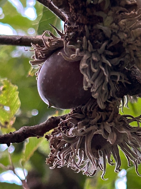 楢、櫟、柏などのブナ科の落葉樹の実を総称して「団栗(どんぐり)」というが、狭義には、その中の「櫟の実」を指す。下半分を包む椀状の殻斗(かくと)は俗に「団栗の袴」と呼ばれ、殻斗を付けたまま山道などに落ちているのを見かけることも多い。歳時記には「団栗」の傍題として掲載されている。