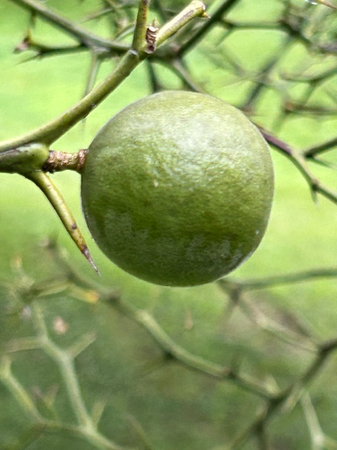 枳殻(きこく・からたち)は中国原産のミカン科の落葉低木。奈良時代以前に渡来し、当初は薬用として栽培されていたが、後に野生化し、本州中部以南の暖地の山中に自生する。夏に白い花が咲いた後青い実を結び、晩秋の頃黄熟する。食用にはならないが、未熟な果実を乾燥させたものが薬用となる。果樹栽培において、柑橘類の台木として枳殻が使われることが多い。