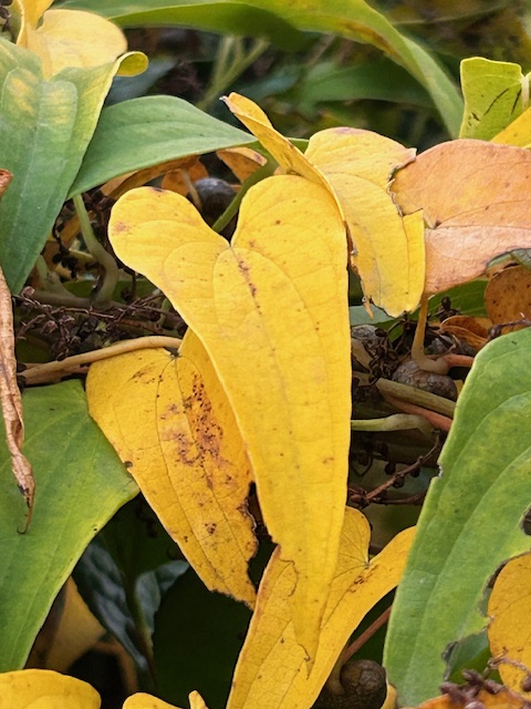 下の写真は、朝晩の冷え込みで、黄葉(もみじ)が目に立つようになった自然薯。茶の木に絡みつきながら伸びている。根は美味とされるが、実際に掘り出したことはない。
