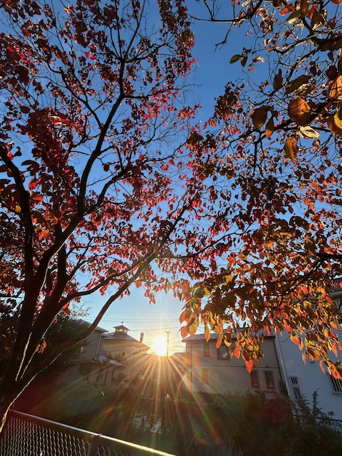 紅葉した葉が日の光を受けて照り輝いていること。「照紅葉(てりもみじ)」ともいう。青空を背景に、赤や黄色の色鮮やかな葉が日差しを受けてさらに美しさを増す。晩秋のひと時の華やぎである。