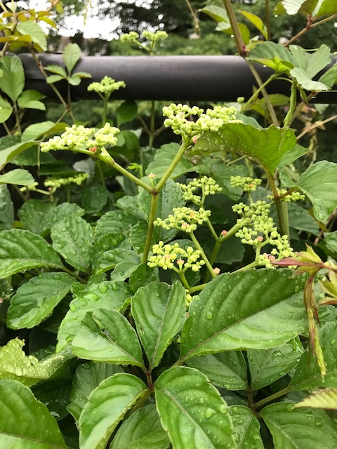 ブドウ科の蔓性多年草。藪や生垣などに絡みついて繁茂し、これが絡まると藪でも枯れるというところから、この名がついた。道端、空き地、雑木林の林縁、荒れ地、草原、土手などのいたるところに繁茂する。別名貧乏蔓(びんぼうかずら)。晩夏から初秋にかけて、葉腋から花柄を伸ばして偏平な集散花序がつき、多数の淡緑色の小花が徐々に開花する。花弁と雄蕊は開花後間もなく散ってしまい、白色の雌蕊が中央に立った橙色の花托が残る。遠目には緑に橙色の小さなつぶつぶが交じって、可憐な趣もある。秋には丸い実が黒く熟す。