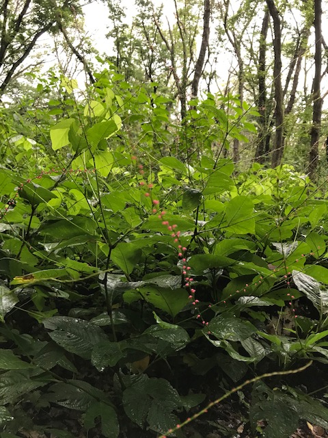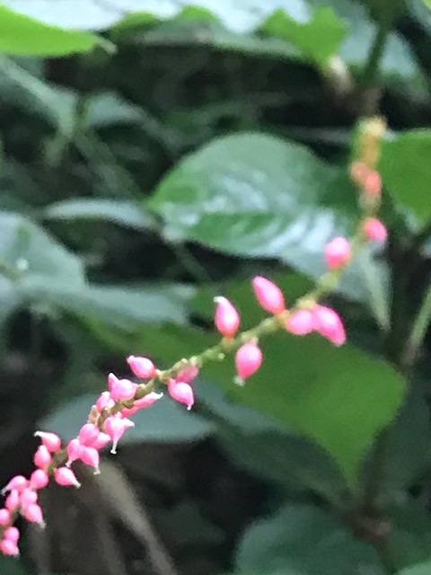 林の縁や小川沿いの木陰などにみられるタデ科の多年草。晩夏・初秋の頃、長く伸びた細い花茎に沿って細かな花を点々とつける。赤花が一般的だが、ギンミズヒキと呼ばれる白花種もある。贈答品を結ぶ飾り紐の水引に似ているのでこの名がある。